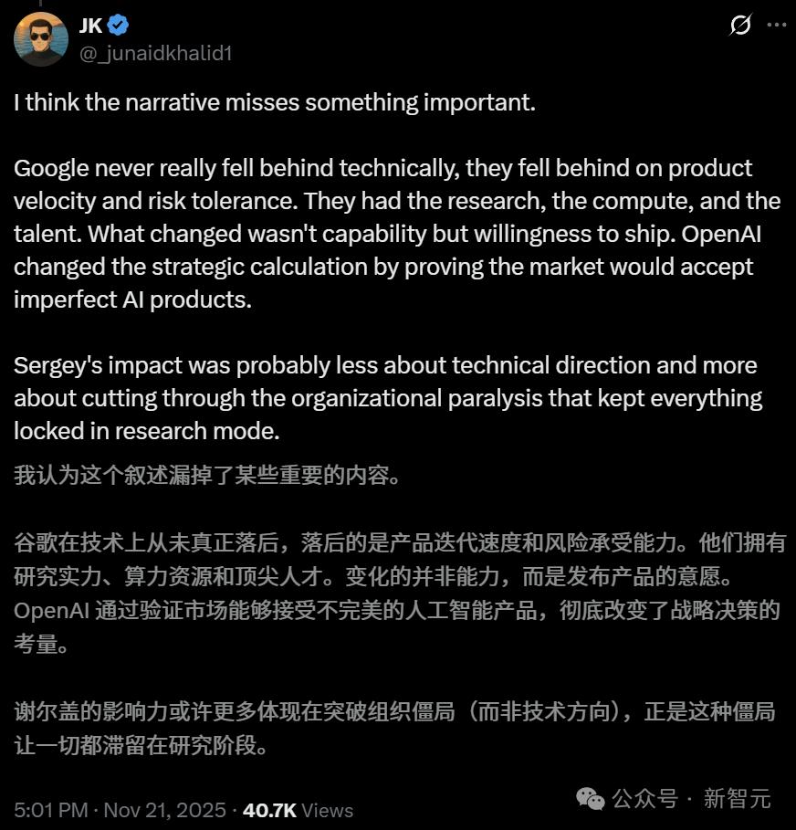 布林的存在直接催化了Gemini 3项目的加速,他专注于解决模型在长逻辑链推理上的「长尾问题」,这是之前职业经理人们因追求短期指标而忽视的领域。