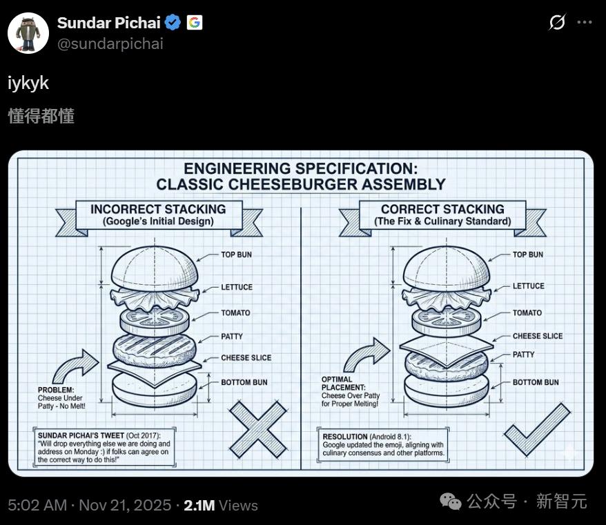 背景故事:2017年,谷歌的汉堡emoji把奶酪放在肉饼下面,瞬间全网炸锅。这直接引发了一场又好笑又撕裂的互联网大战,大家疯狂争论「正确」的汉堡该怎么叠。 皮查伊当时发推调侃:你们要是能统一意见,我就放下手头一切马上修。结果大家真的统一了,Android没几天就更新,把奶酪挪到了肉饼上面。 现在看来,Gemini 3.0也完美遵守了这个「正确顺序」。
