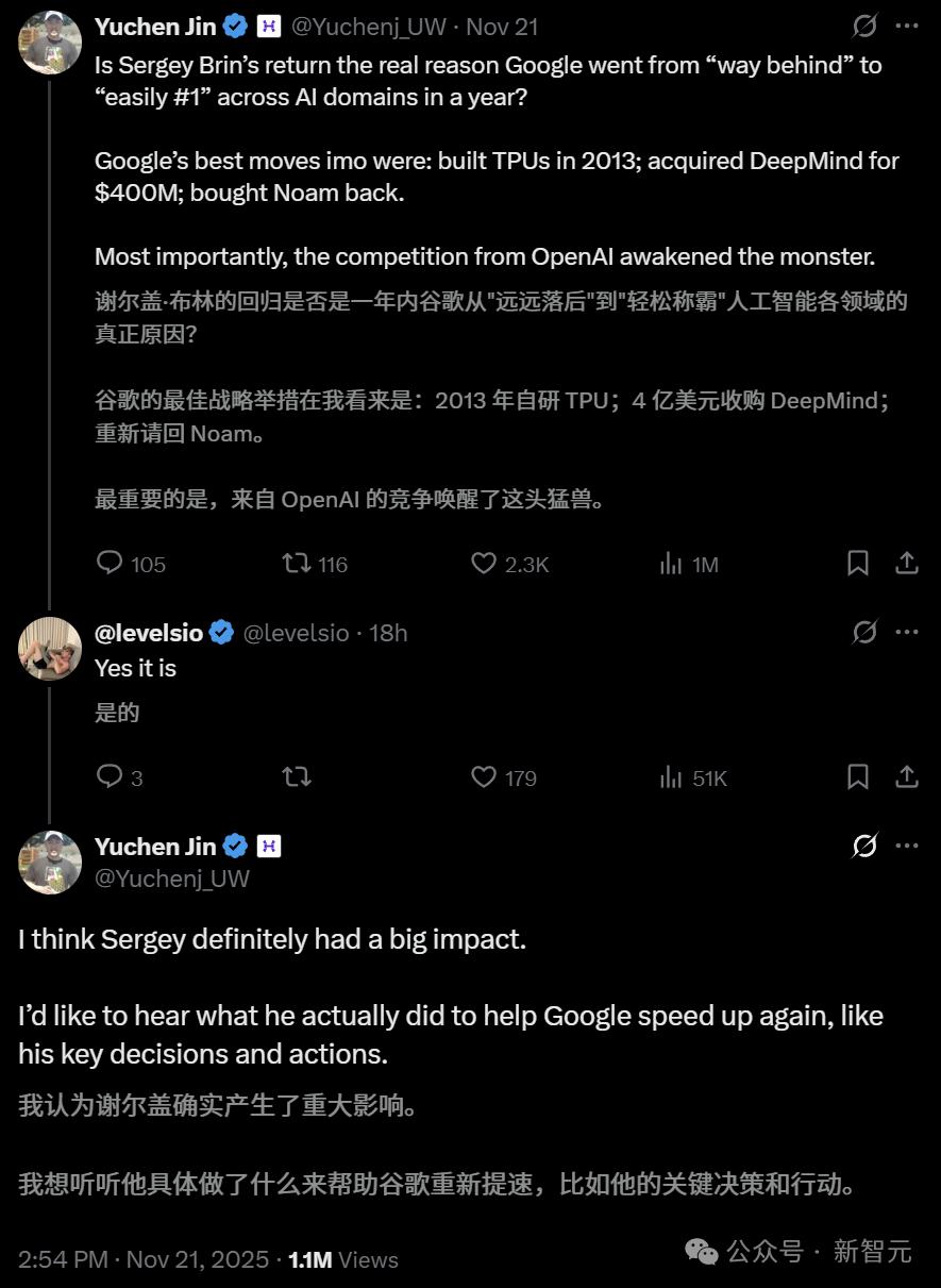 X的网友将布林的回归定义为:谷歌在一年内从「远远落后」到「轻松称霸」。
