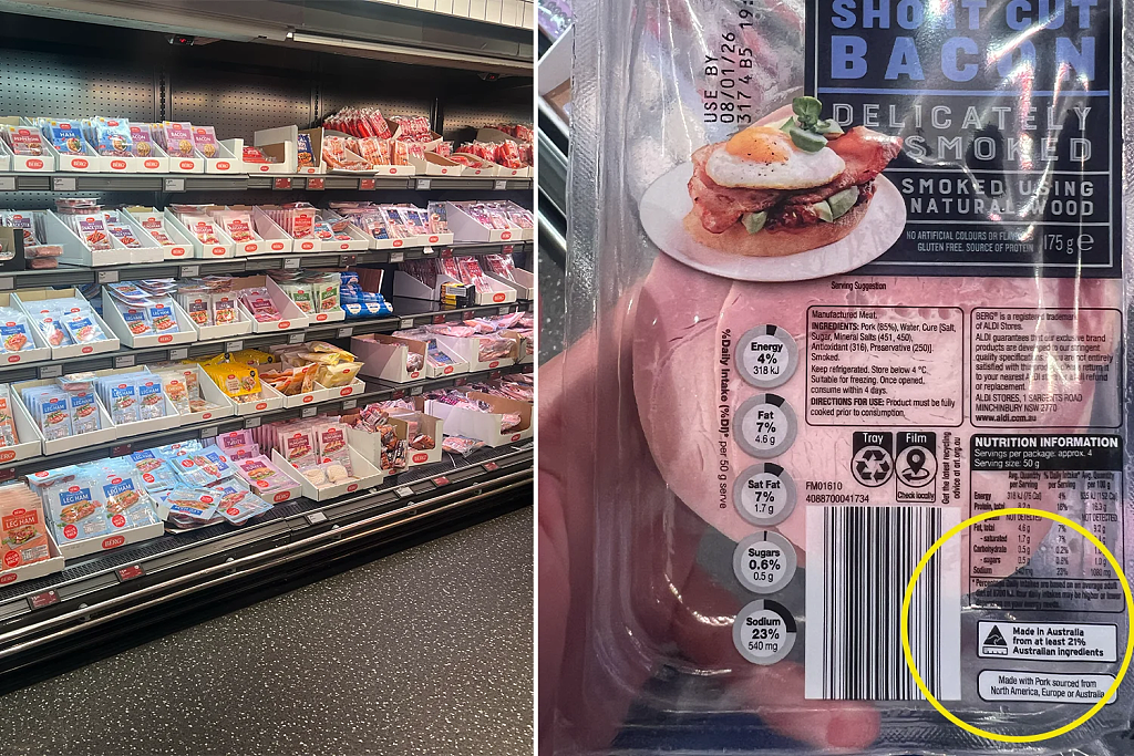 “如果你买的是鲜猪肉、带骨火腿或烤肉,那都是澳洲本地产品,可以放心购买。但如果是火腿片和培根,其中有约70%来自美国和欧洲。”