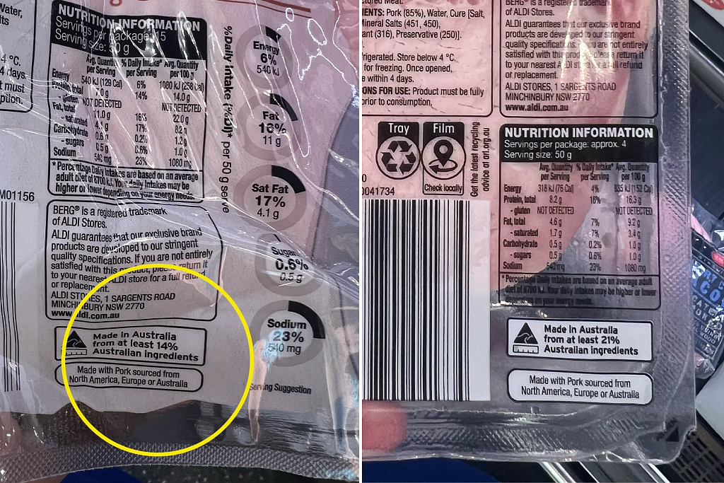 令人困惑的是,这些产品中有许多都印有“澳洲制造”的绿色金色三角形袋鼠标志,但这仅意味着产品是在澳洲进行加工、包装或烹制的,而所用的猪肉大多来自海外。