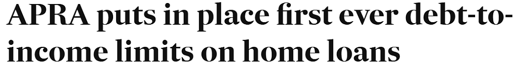 澳洲监管机构宣布,将从明年开始对房贷设定“负债收入比”(Debt-to-Income Ratio, DTI)限制,旨在防止出现大量高风险房贷。