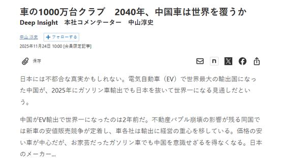 相比之下,日本车企在纯电转型节奏和全球化产能布局上相对保守。面对中国车企“油电双线出击”的攻势,日本传统出口优势正面临挑战。中山淳史指出,若这一趋势持续,到2040年,“千万辆级”汽车销量俱乐部或将由中国品牌主导,全球汽车产业格局可能发生根本性重塑。