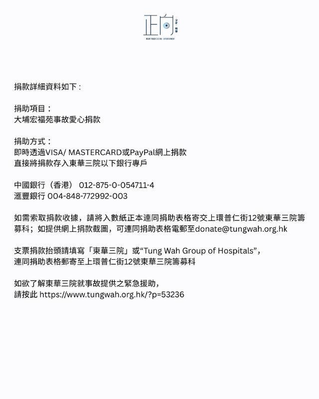 诚挚呼吁所有圈中友好与歌迷,将原定用于购买花篮的款项,转捐至“东华三院”等本地募捐平台作救灾用途。