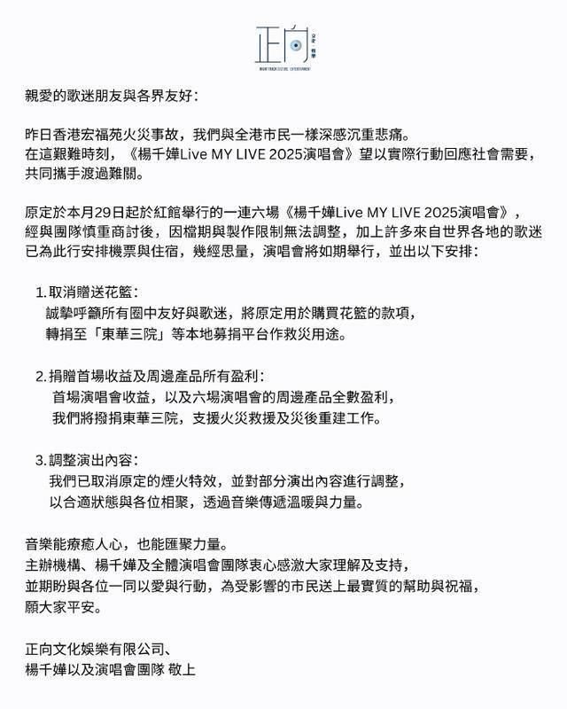 11月27日,正向文化娱乐发布公告,内容包括:杨千嬅呼吁将花篮钱转作救灾、捐赠首场收益及周边产品所有盈利、取消原定的烟火特效,并对部分演出内容进行调整。全文如下:昨日香港宏福苑火灾事故,我们与全港市民一样深感沉重悲痛。在这艰难时刻,《杨千嬅Live MY LIVE 2025演唱会》望以实际行动回应社会需要,共同携手渡过难关。原定于本月29日起于红馆举行的一连六场《杨千嬅Live MY LIVE 2025演唱会》,经与团队慎重商讨后,因档期与制作限制无法调整,加上许多来自世界各地的歌迷已为此行安排机票与住宿,几经思量,演唱会将如期举行,并作出以下安排: