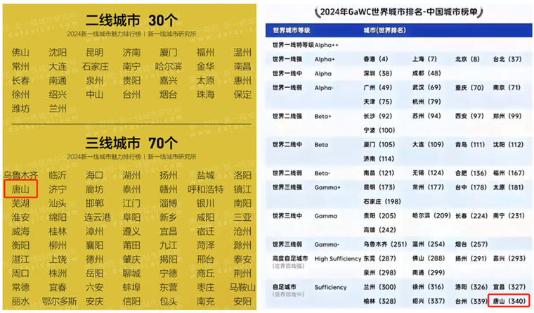 然而,这样一座经济强市,在《新一线城市魅力排行榜》中,与枣庄、安阳等城市位列同一等级,成为唯一一个被列入三线的万亿城市。要知道,就连同省GDP不足唐山一半的保定,都跻身二线城市。甚至,在最新的世界城市排名榜单中,唐山被排除在三线之外。