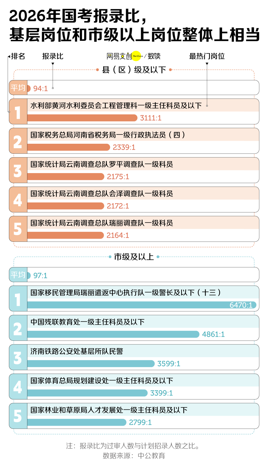 2026 年国考,市级以上岗位的报录比为 97:1,略高于县(区)级及以下机构岗位的 94:1。同时,一些市级以上的岗位过于抢手:在报录比超过 3000:1 的岗位中,县区级只有 1 个,而市级以上就有 4 个。