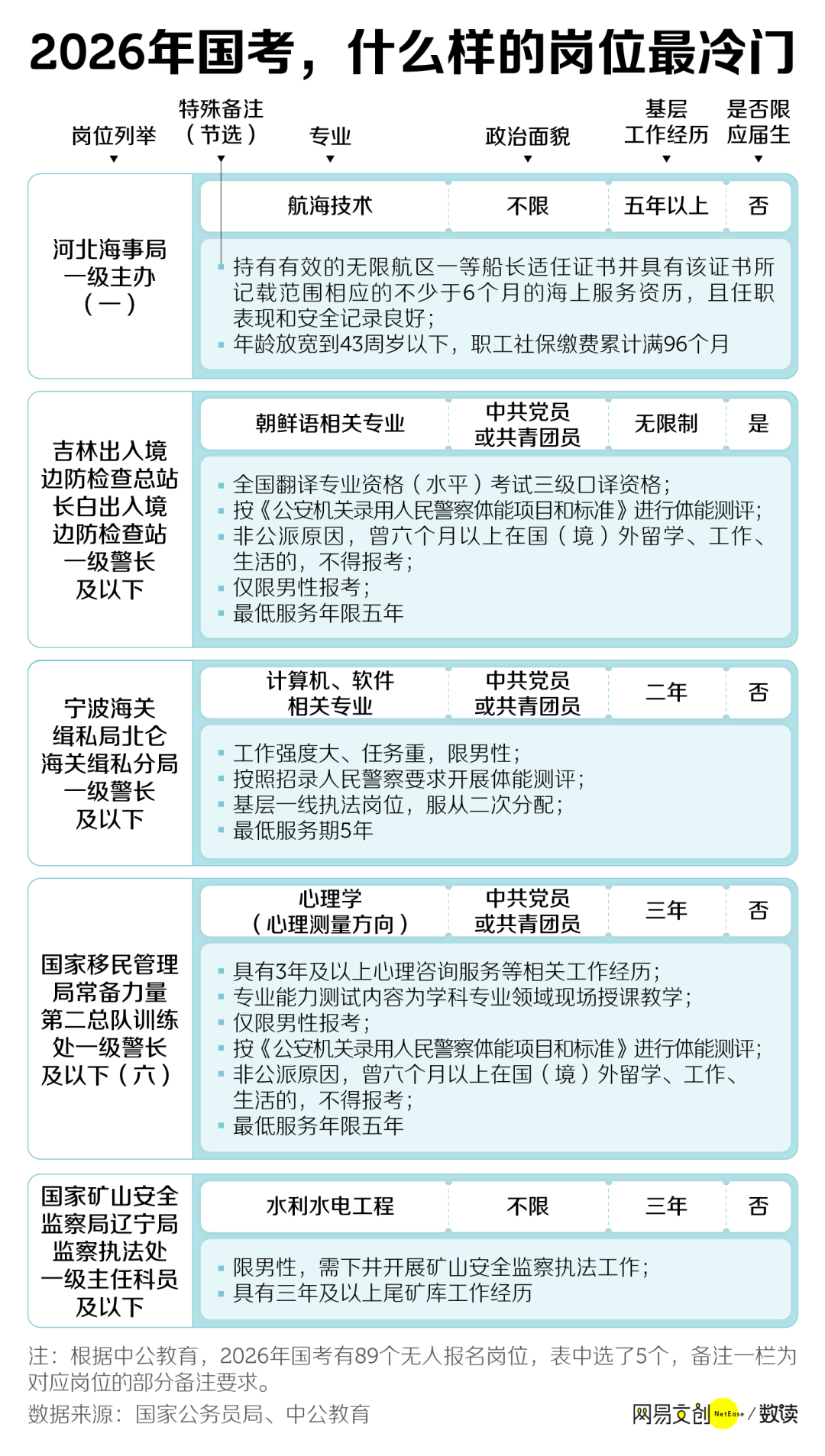 根据中公教育数据,2026 年国考有 89 个无人报考的岗位,主要分布在边检、气象局、水利局等部门。这些岗位通常需要考生具备一技之长,或具备一定的基层工作经验,或能接受艰苦条件。