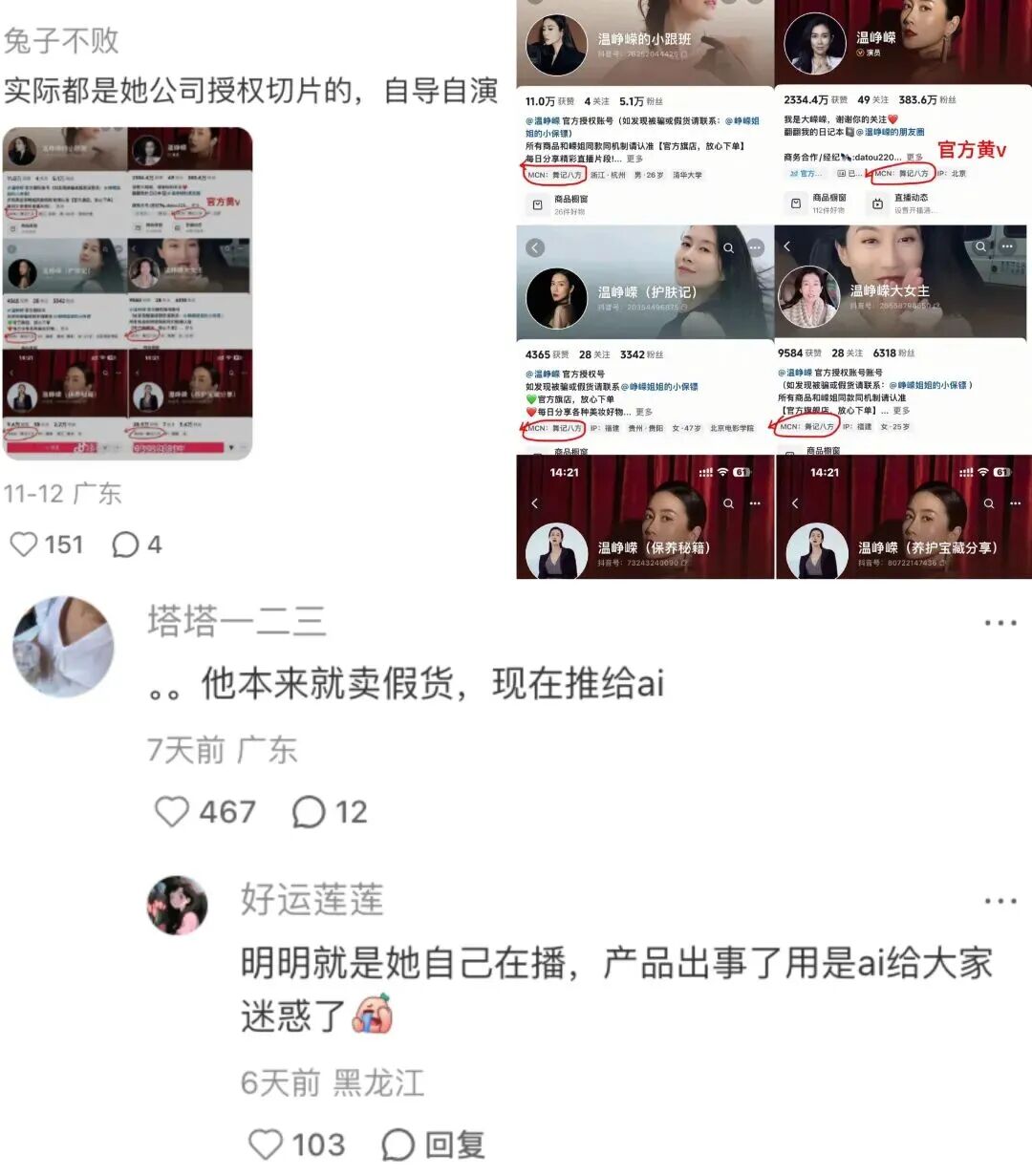 有人发现,那些所谓盗用肖像的直播间似乎并不是AI套皮,而是温峥嵘本人公司授权的直播切片视频。因为售卖产品收到了投诉,才把责任一股脑推给了AI。
