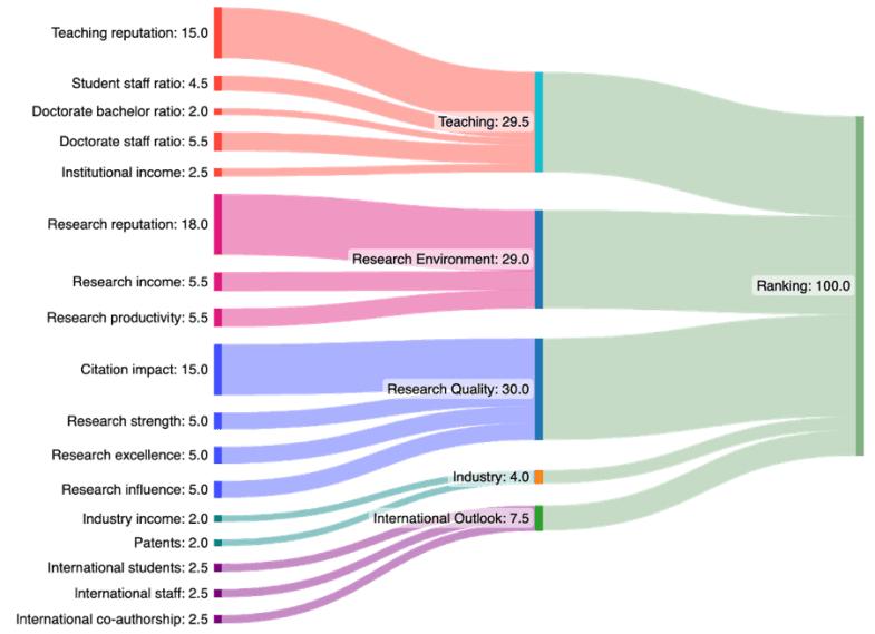 世界大学排名指标权重:研究与教学占近九成。