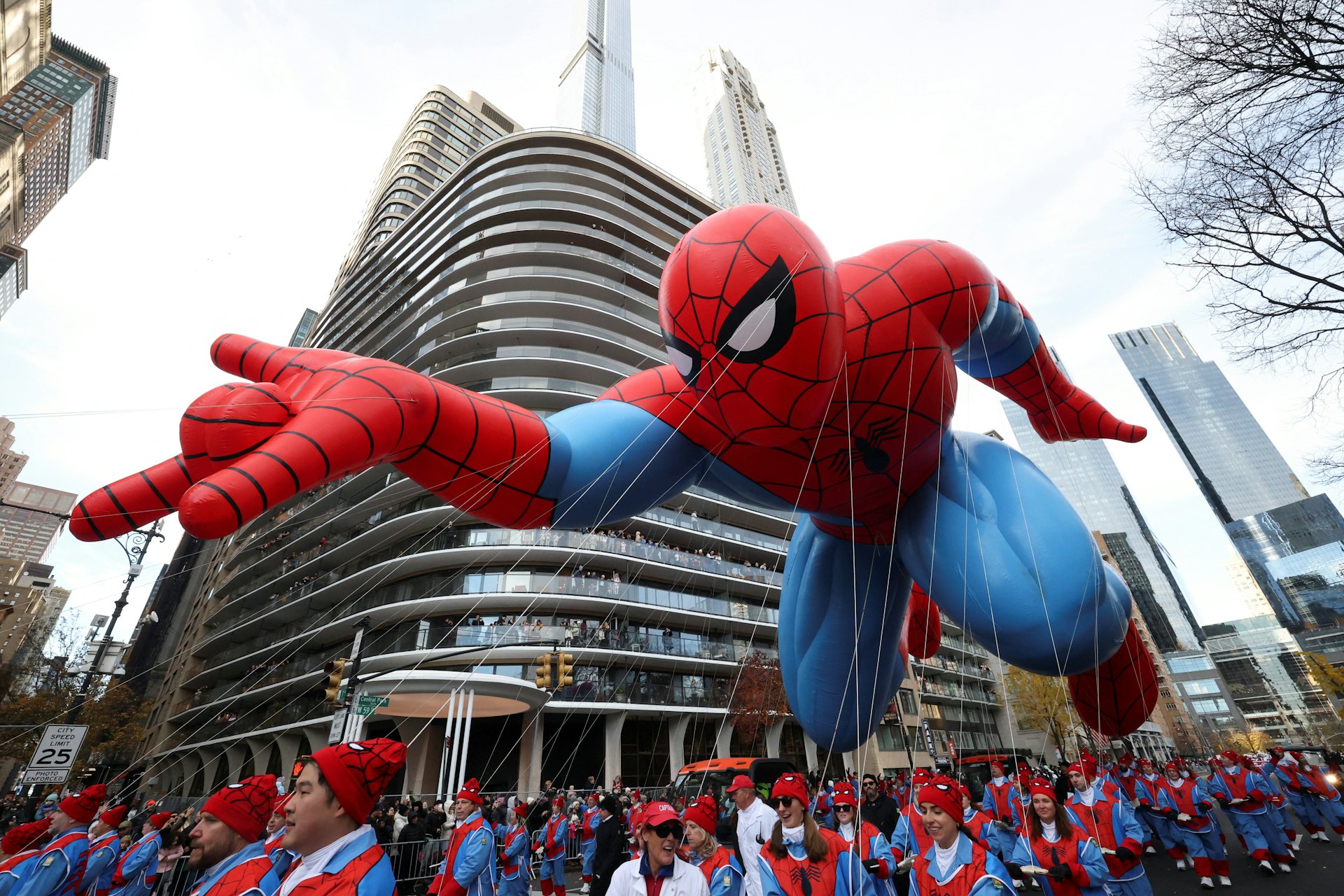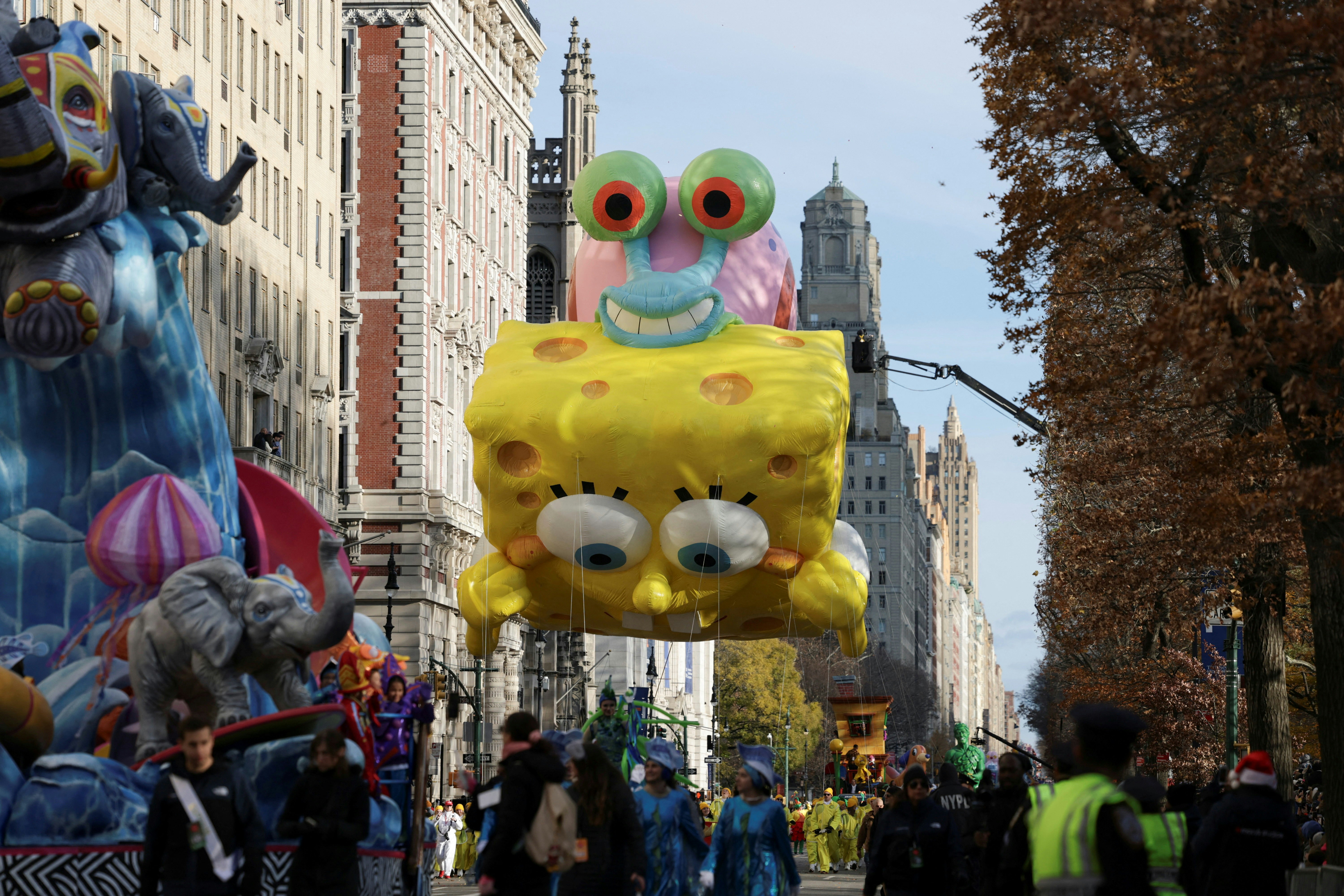 美国纽约于11月27日(周四)举行“梅西感恩节大游行”(Macy's Thanksgiving Day Parade)中,各种巨型气球升空,包括海绵宝宝、马里奥(Mario)、蜘蛛侠(Spider Man)等。