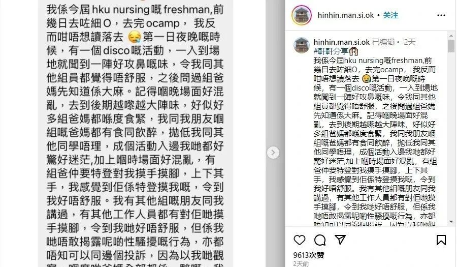 起因是有位自称港大护理系的新生,在IG上发了一篇长文,讲述自己参加迎新营的遭遇。